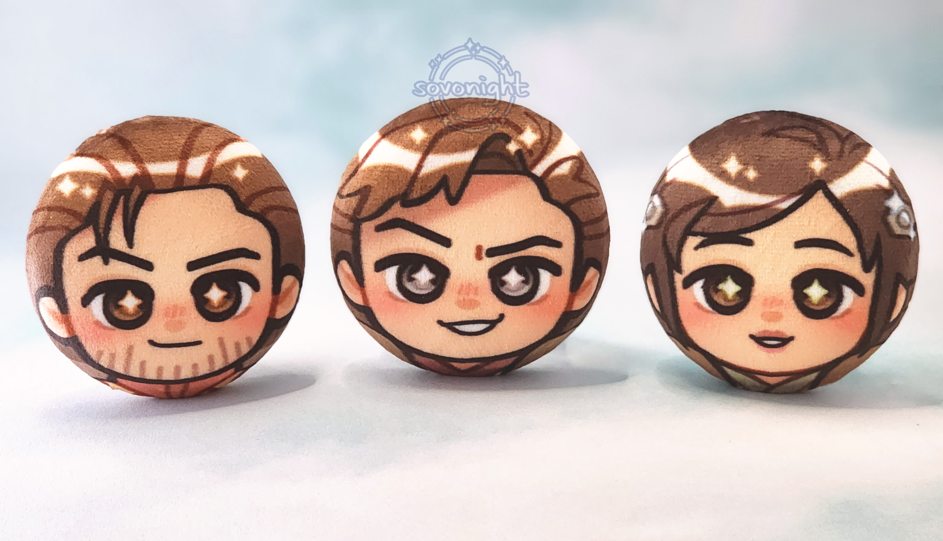 printed on soft plush fabric, these buttons are 1 cm thick, with stuffing added for extra squishability!