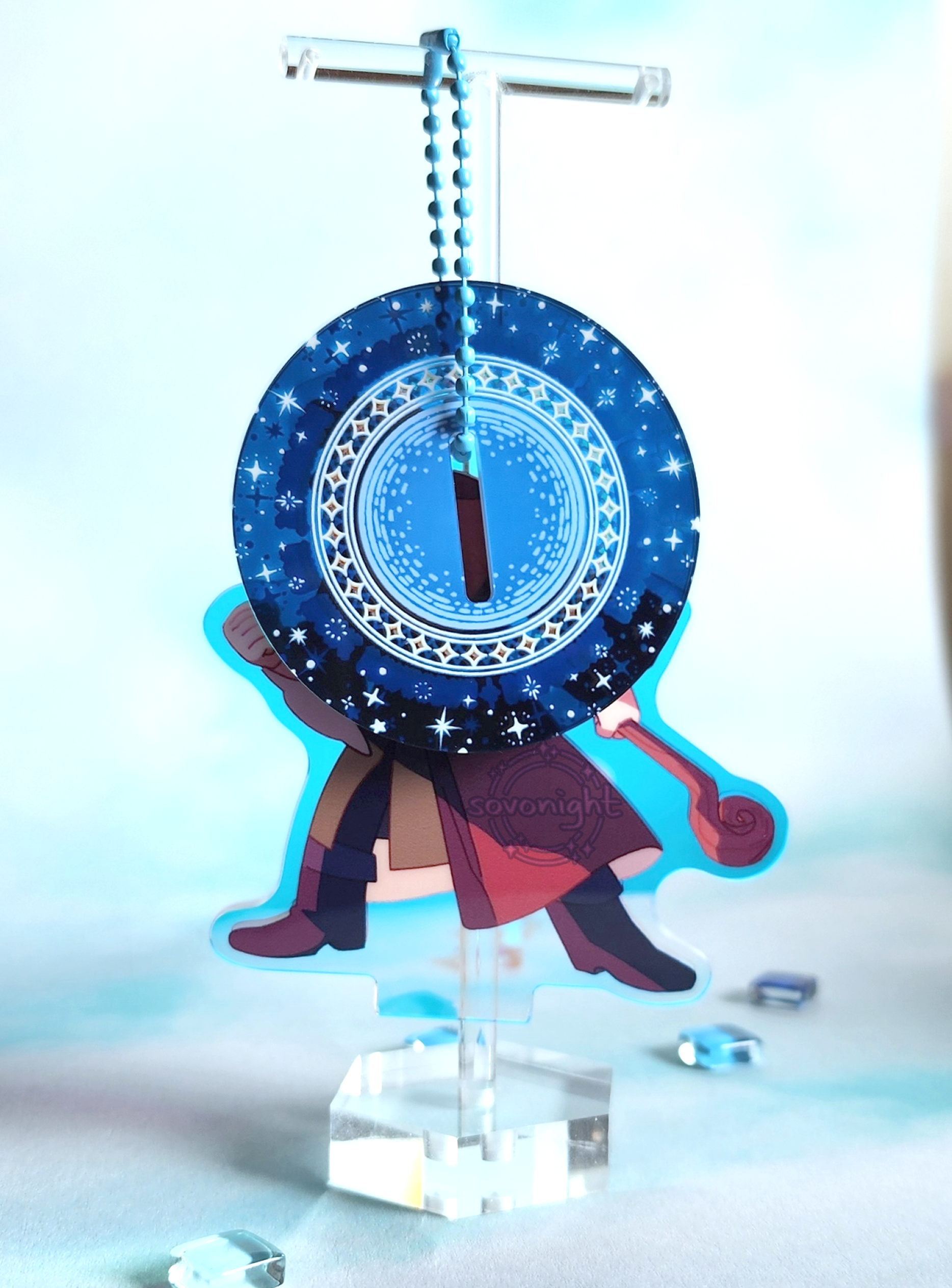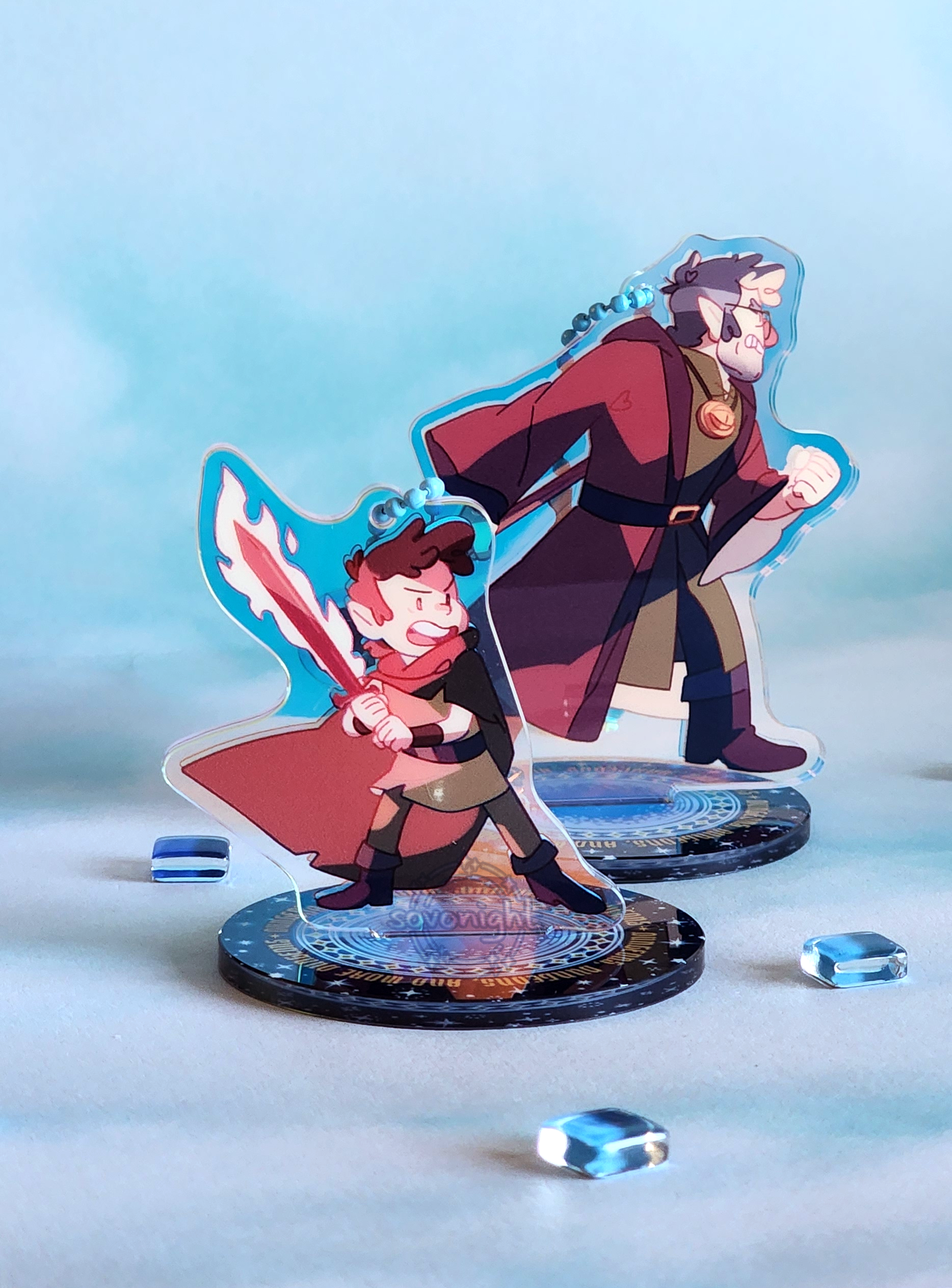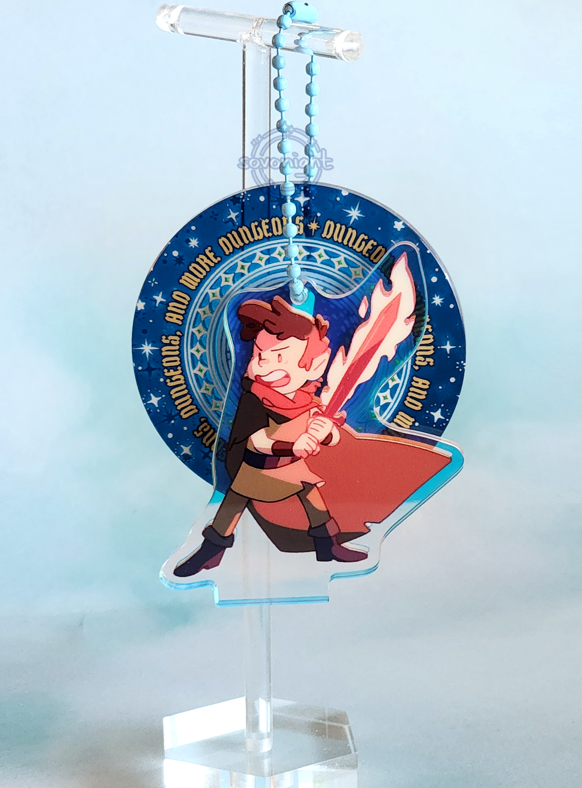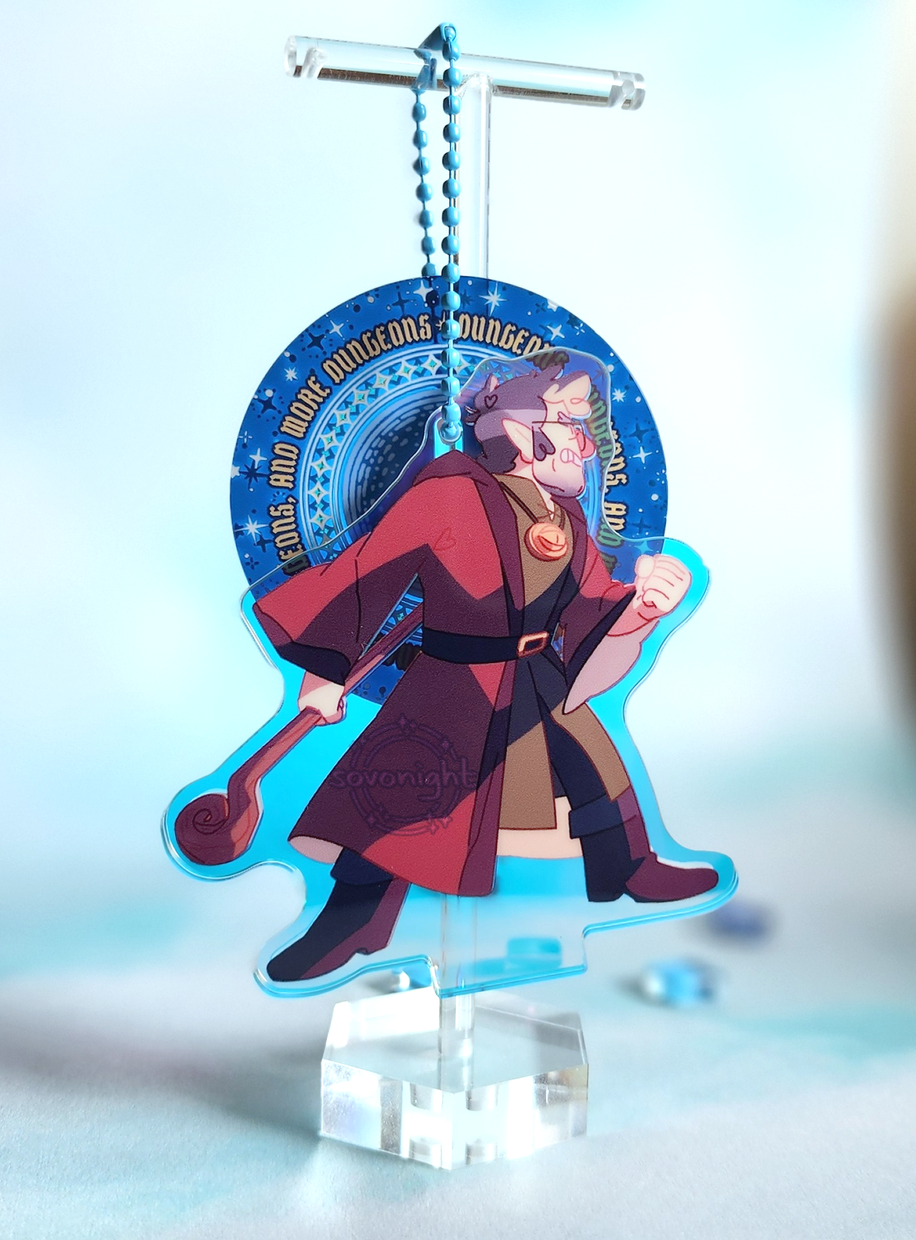 roll some dice & break some faces with this pointy-eared nephew and grunkle duo who have been perfectly miniaturized for your adventures! this charm can convert into a standee, and vice versa—simply undo the chain and attach the standee base to convert between the two.